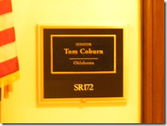 The following picture is difficult to make out, but the plaque commemorates the office formerly occupied by President Warren G. Harding, when he served as a senator from Ohio. The office is directly across the hall from Senator Coburn’s.