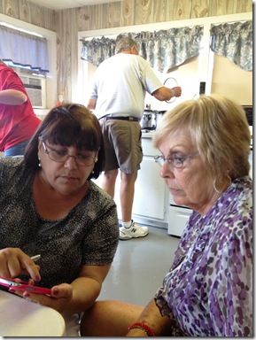 Above, Mary Wier assists Wilma Adams with her new phone. Below left, Rosie and Donna Keever strike a pose for the photographer, while Ann Fowler enjoys a book under the shade of her RV awning (lower right).